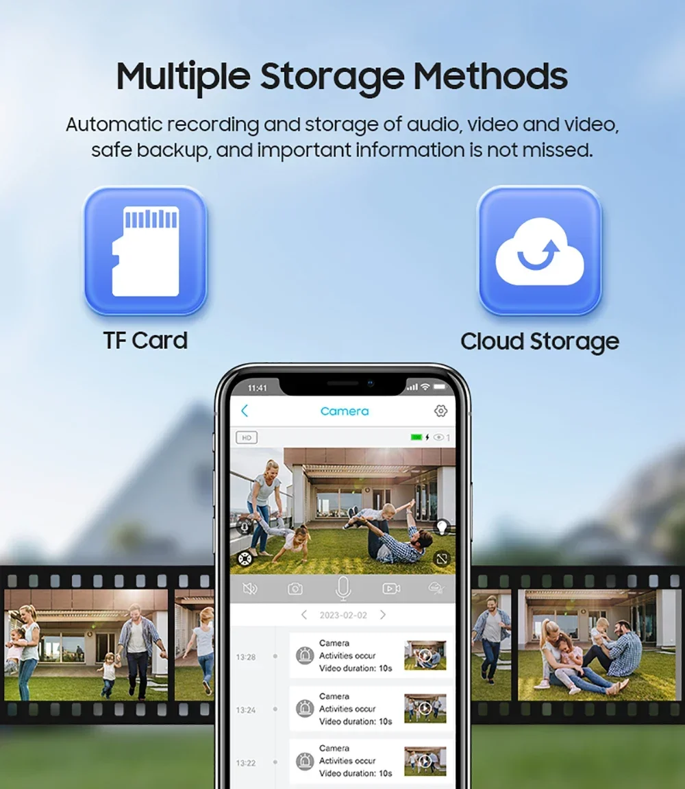Support TF Card Storage and Cloud Storage(Extra Pay For):The camera supports up to 128GB TF card local backup and also provides cloud storage service(Need to pay extra cost).