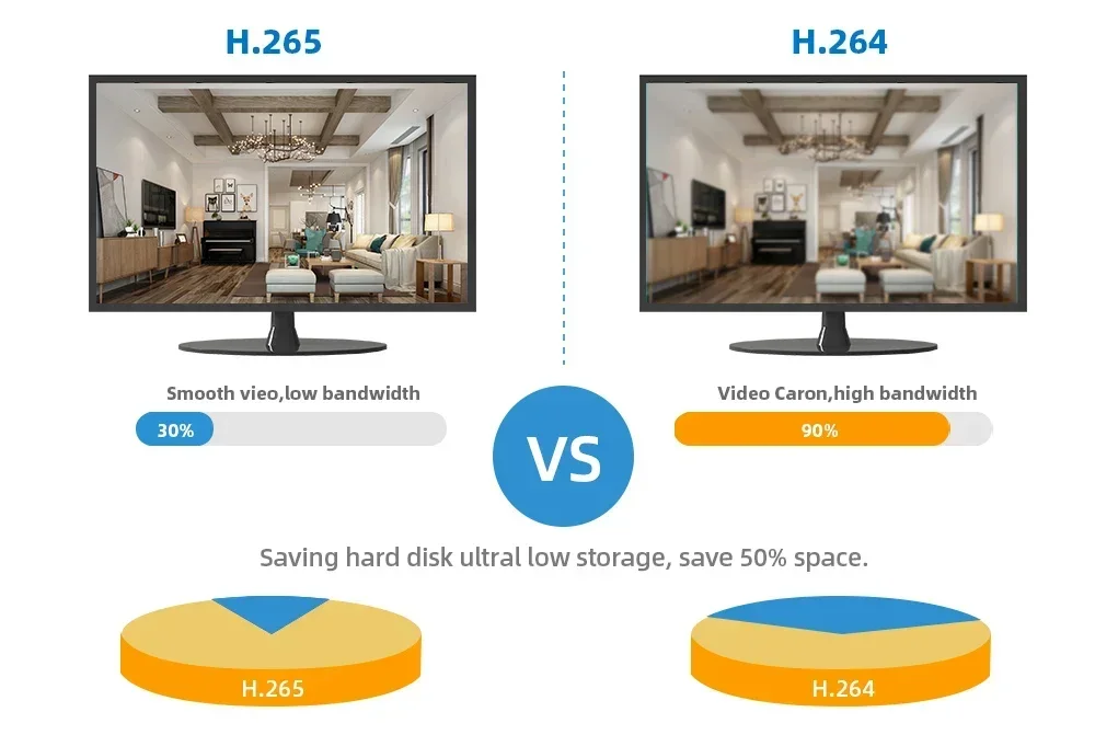 Advanced H.265 Video Compression:H.265 (HEVC) doubles the coding efficiency compared with its predecessor H.264. H.265 video saves around 50% of the bit rate at the same quality of coding.H.265 only need less bandwidth,faster loading speed,more smooth video,Lower bite rate,higher image quality!